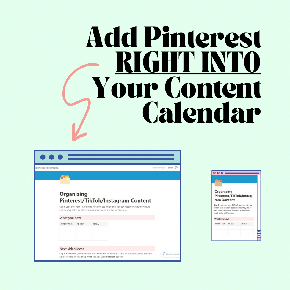 To avoid the double content creation, here’s a fillable Notion template that you can duplicate for yourself and ease into filming, editing, and scheduling for Pinterest as you continue to show up on your other social media platforms.